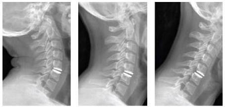 Aspecto radiográfico da prótese cervical e extensão, neutro e flexão.