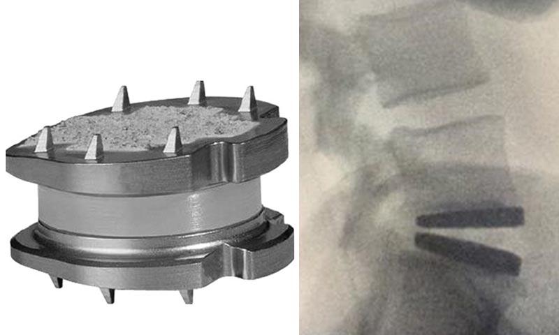 Ao lado, exemplo de prótese discal que preserva o movimento no segmento operado.