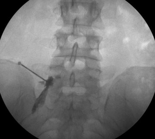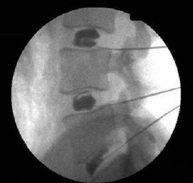 A exata posição da agulha é confirmada com injeção prévia do meio de contraste, que traça o trajeto exato da raiz estudada.